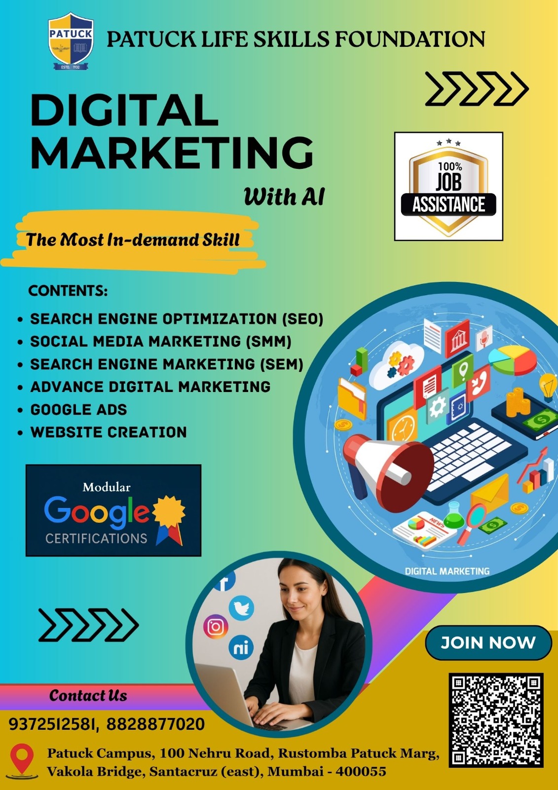 At Patuck Life Skills Foundation, we provide comprehensive skill development programs designed to equip individuals with practical knowledge, technical expertise, and essential life skills. Our offerings range from Digital Careers such as Graphic Designing, Digital Marketing, Cybersecurity, and Office Automation to Life Skills Courses like Cooking, Stitching & Handicrafts, Beauty & Wellness, and Gadget Repairing. Additionally, our workshops on Personality & Grooming, Emotional Well-being, Career Guidance, Health & Wellness, and Disaster Management provide focused learning experiences that empower participants to apply their skills in real life. Every program is designed to bridge the gap between education and employability, enabling learners to thrive professionally and personally.